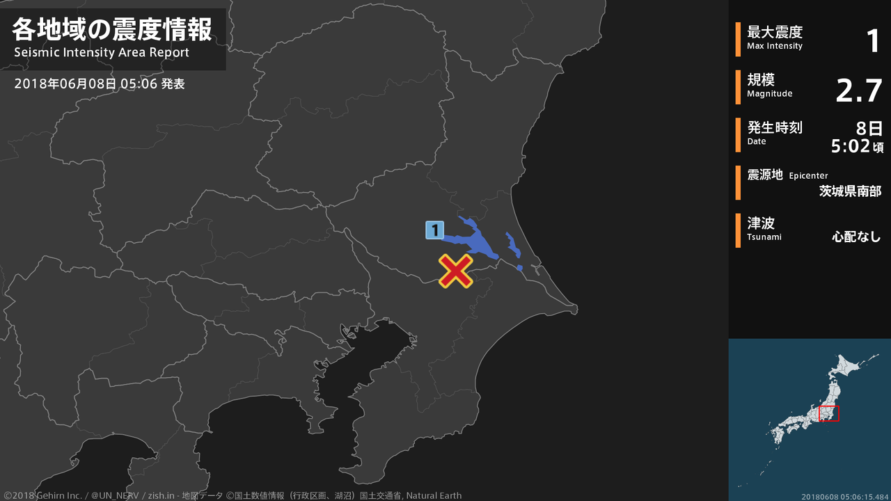 【地震情報 2018年6月8日】5時2分頃、茨城県南部を震源とする地震がありました。震源の深さは約40km、地震の規模はM2.7、最大震度1を茨城県で観測しています。この地震による津波の心配はありません。#地震 #茨城県
