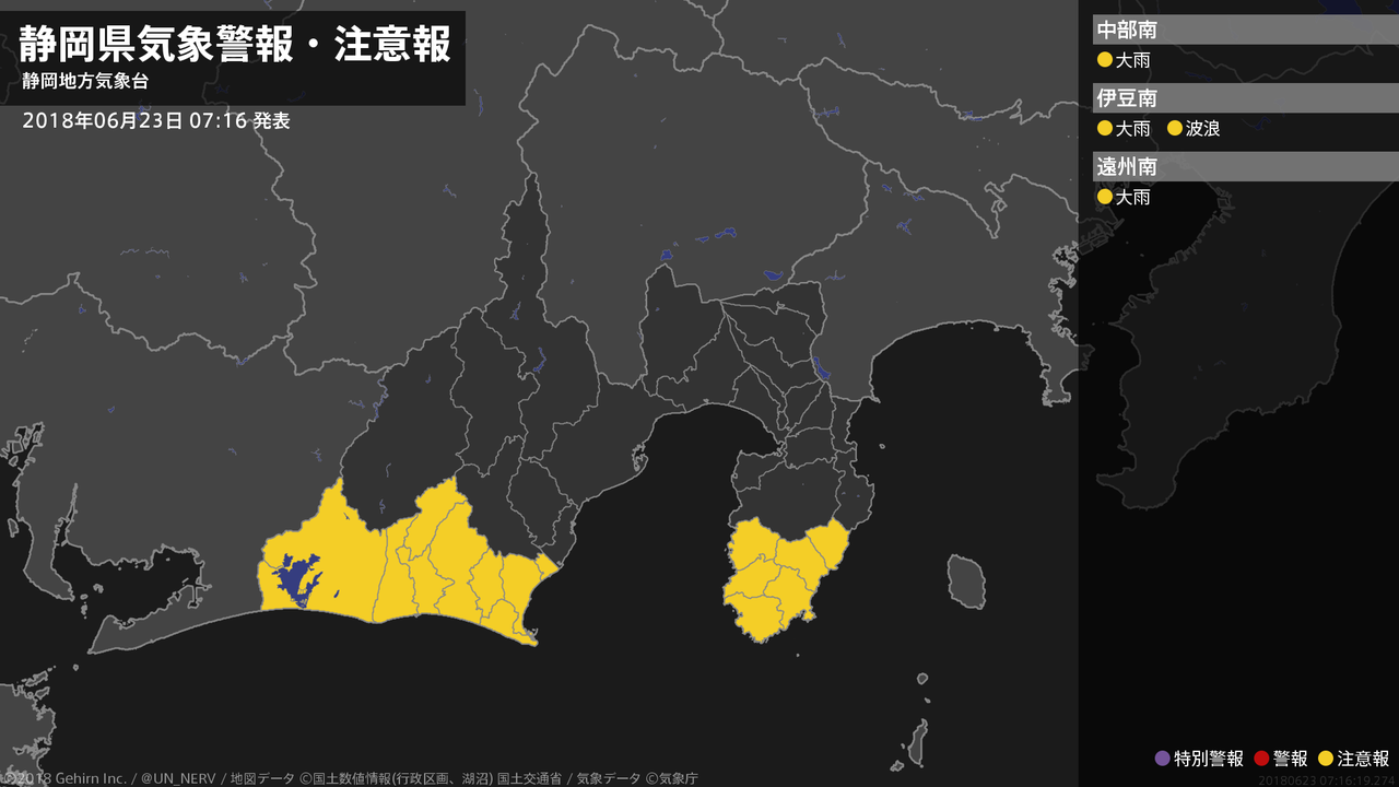 【静岡県 気象警報・注意報 2018年06月23日 07:16】中部、伊豆、西部では、23日夜のはじめ頃まで土砂災害に注意してください。伊豆では、23日夜のはじめ頃から24日明け方まで高波に注意してください。#気象警報注意報 #静岡県