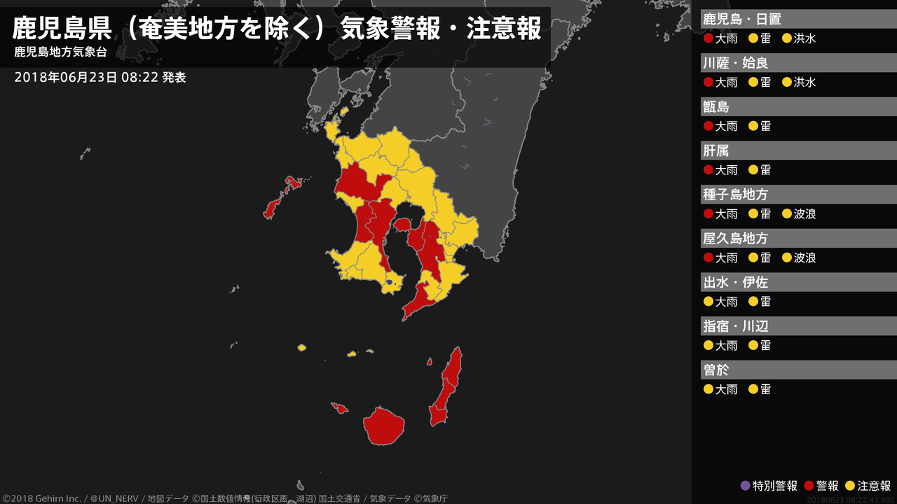 【鹿児島県(奄美地方を除く) 気象警報 2018年06月23日 08:22】薩摩、大隅地方では23日夜遅くまで、種子島・屋久島地方では24日朝まで、土砂災害に警戒してください。#気象警報 #気象警報注意報 #鹿児島県(奄美地方除く)