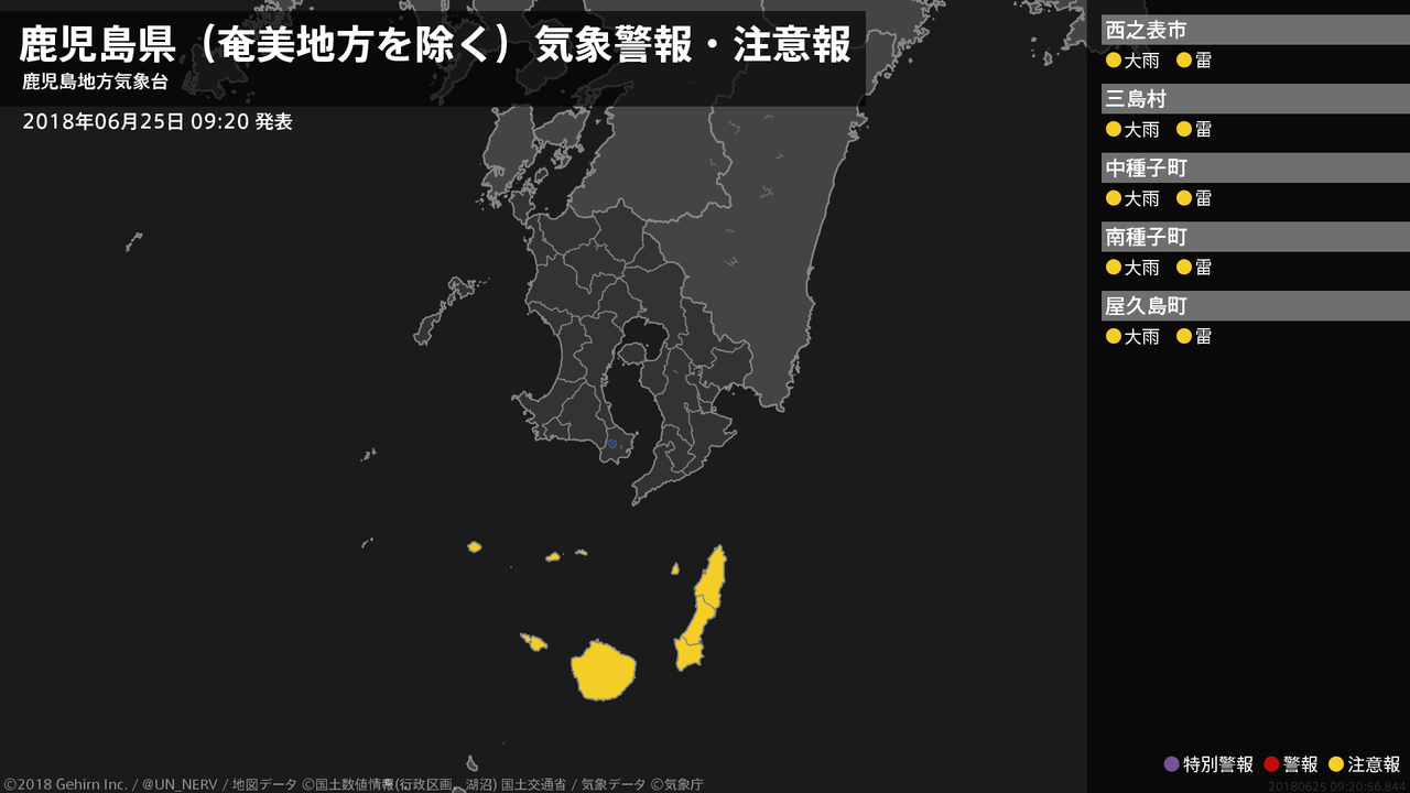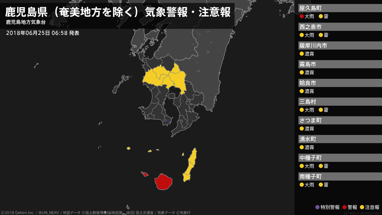 【鹿児島県(奄美地方を除く) 気象警報 2018年06月25日 06:58】種子島・屋久島地方では、25日昼過ぎまで土砂災害に警戒してください。#気象警報 #気象警報注意報 #鹿児島県(奄美地方除く)