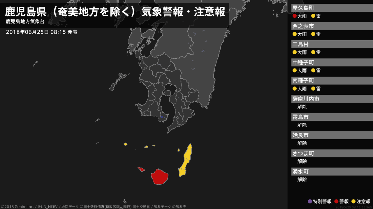 【鹿児島県(奄美地方を除く) 気象警報・注意報 2018年06月25日 08:16】種子島・屋久島地方では、25日昼過ぎまで土砂災害に警戒してください。#気象警報注意報 #鹿児島県(奄美地方除く)
