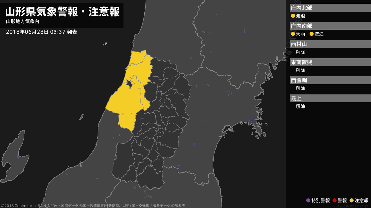 【山形県 気象警報・注意報 2018年06月28日 03:37】庄内では、28日明け方まで土砂災害や高波に注意してください。#気象警報注意報 #山形県