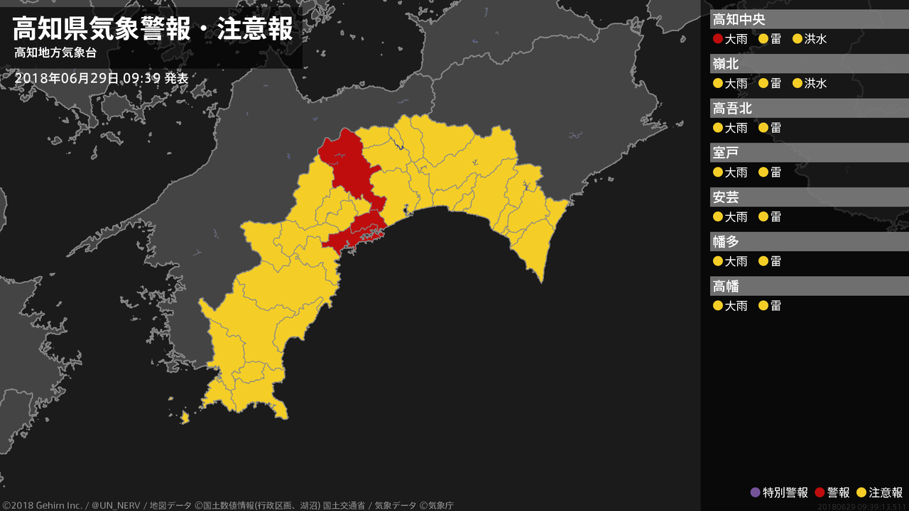 【高知県 気象警報 2018年06月29日 09:39】中部では、29日夕方まで低い土地の浸水に警戒してください。#気象警報 #気象警報注意報 #高知県
