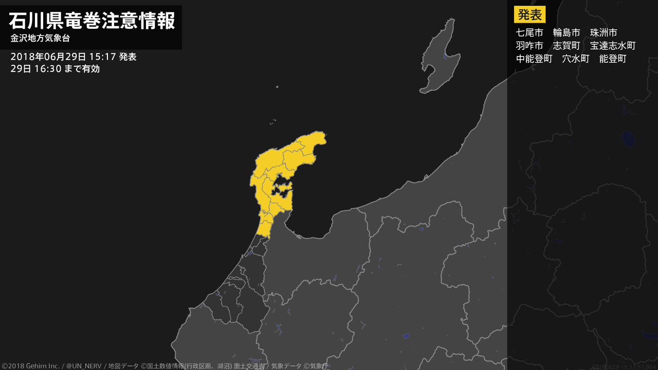 石川県は、竜巻などの激しい突風が発生しやすい気象状況になっています。頑丈な建物内に移動するなど安全確保に努めてください。この情報は29日16:30まで有効です。