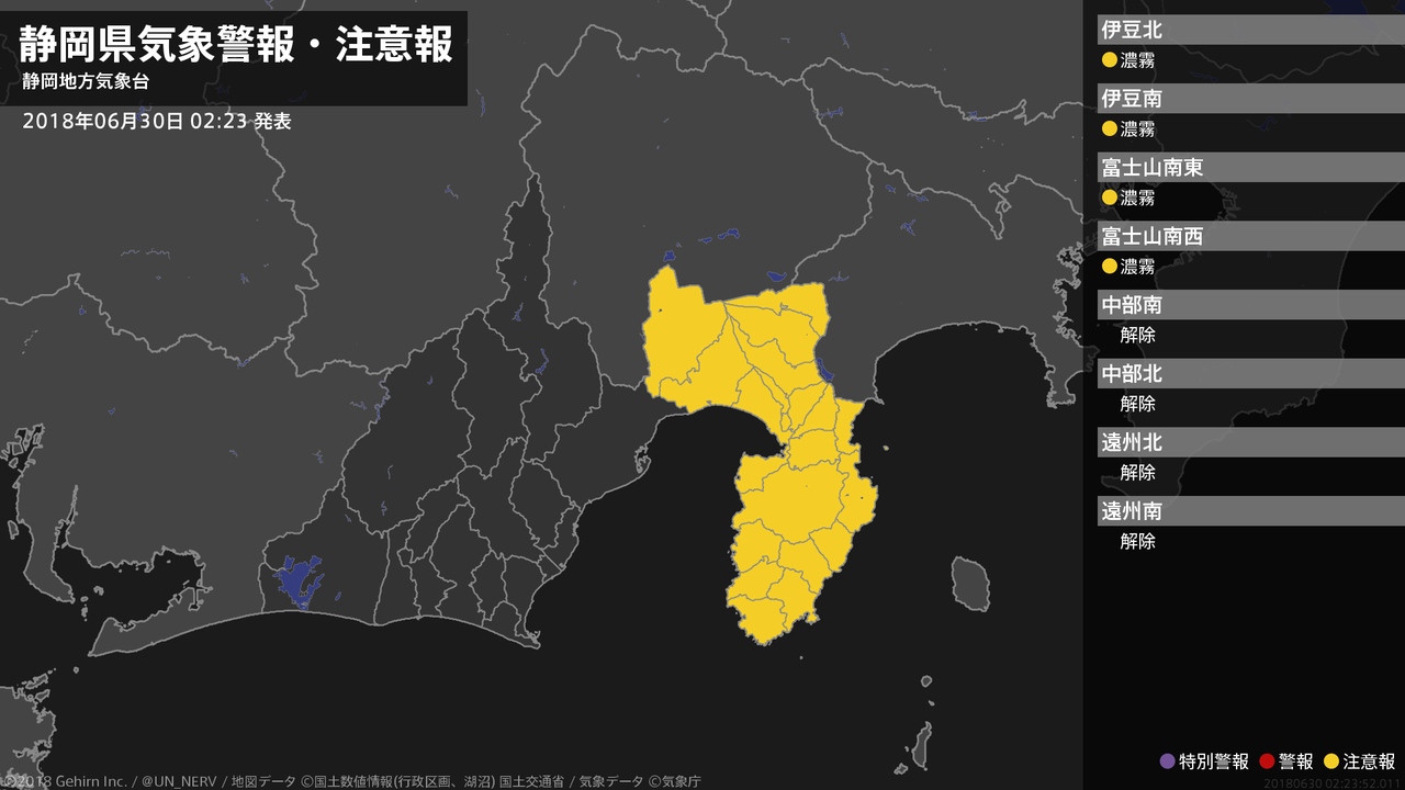 【静岡県 気象警報・注意報 2018年06月30日 02:23】伊豆、東部では、30日昼前まで濃霧による視程障害に注意してください。#気象警報注意報 #静岡県