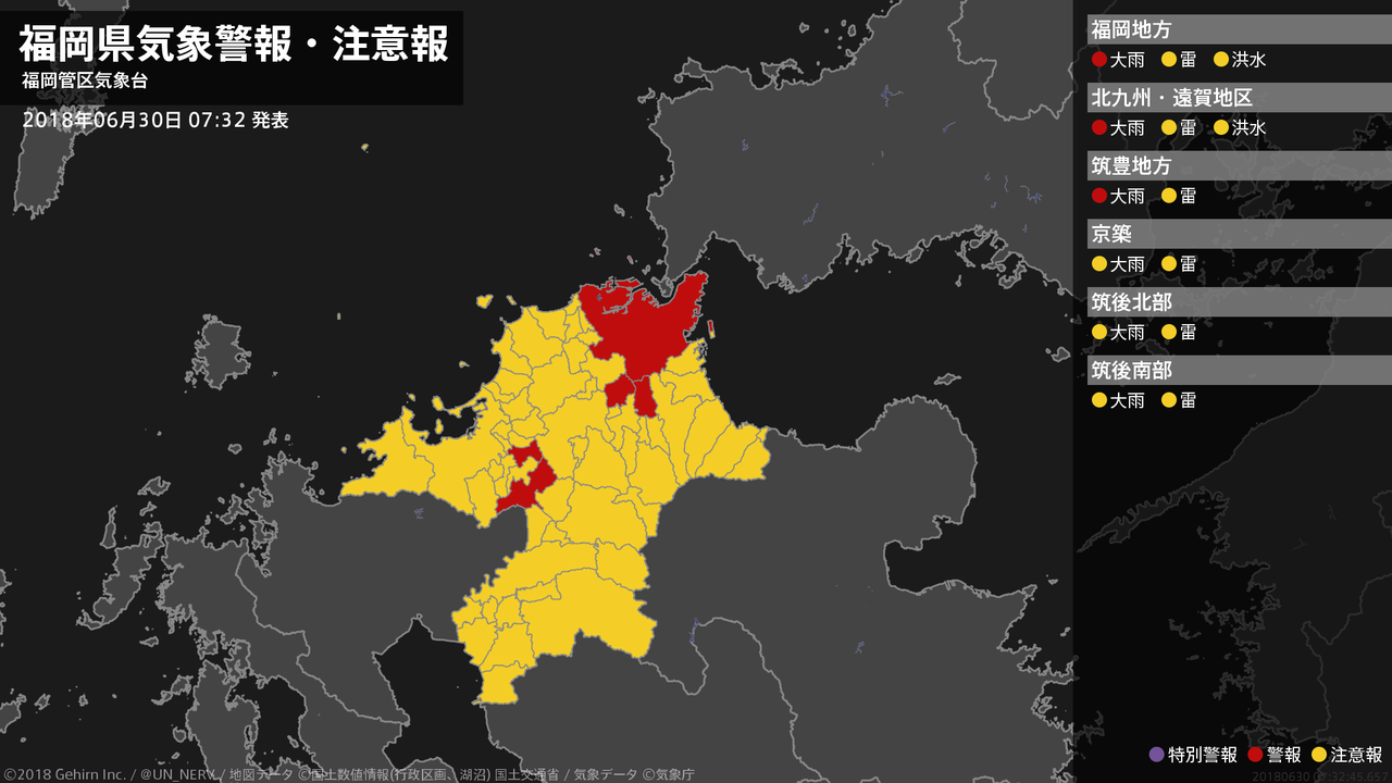 【福岡県 気象警報 2018年06月30日 07:32】福岡、北九州、筑豊地方では、30日昼過ぎまで土砂災害に警戒してください。#気象警報 #気象警報注意報 #福岡県