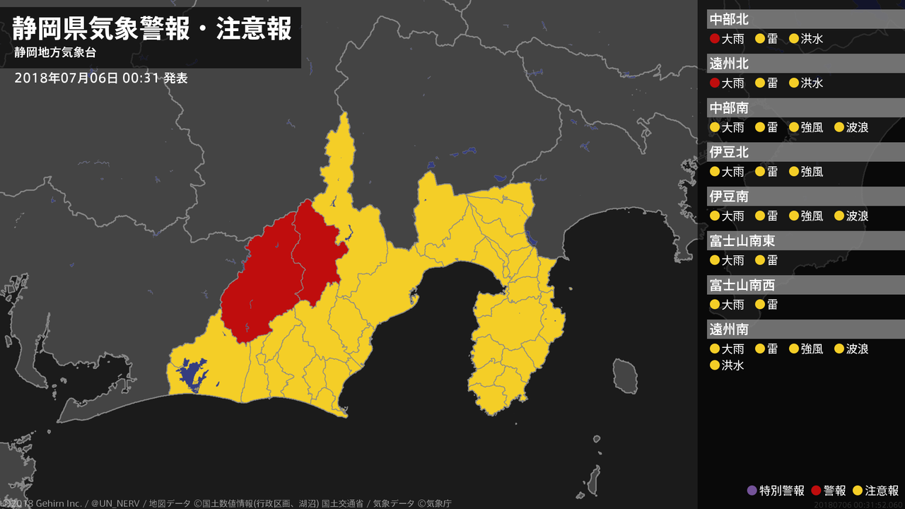 【静岡県 気象警報・注意報 2018年07月06日 00:31】