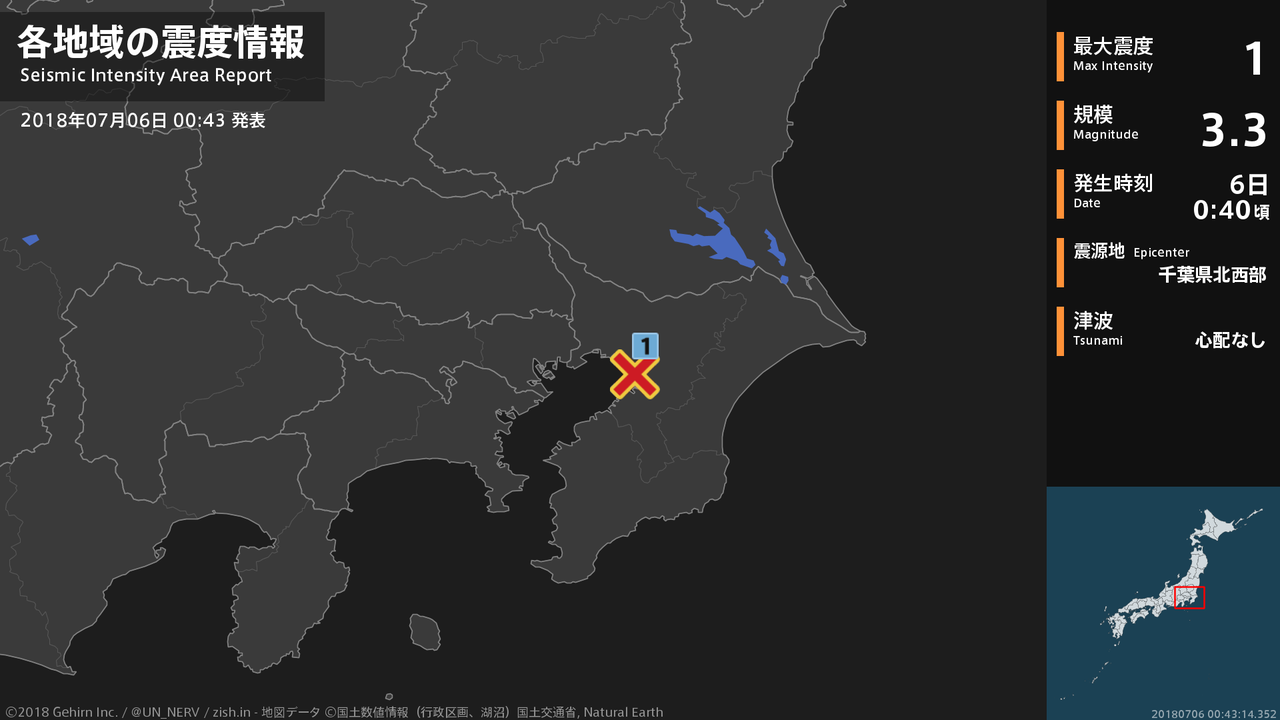 0時40分頃、千葉県北西部を震源とする地震がありました。震源の深さは約70km、地震の規模はM3.3、最大震度1を千葉県で観測しています。この地震による津波の心配はありません。