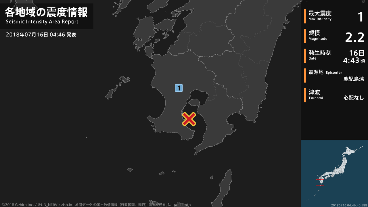【地震情報 2018年7月16日】4時43分頃、鹿児島湾を震源とする地震がありました。震源の深さは約10km、地震の規模はM2.2、最大震度1を鹿児島県で観測しています。この地震による津波の心配はありません。#地震 #鹿児島県
