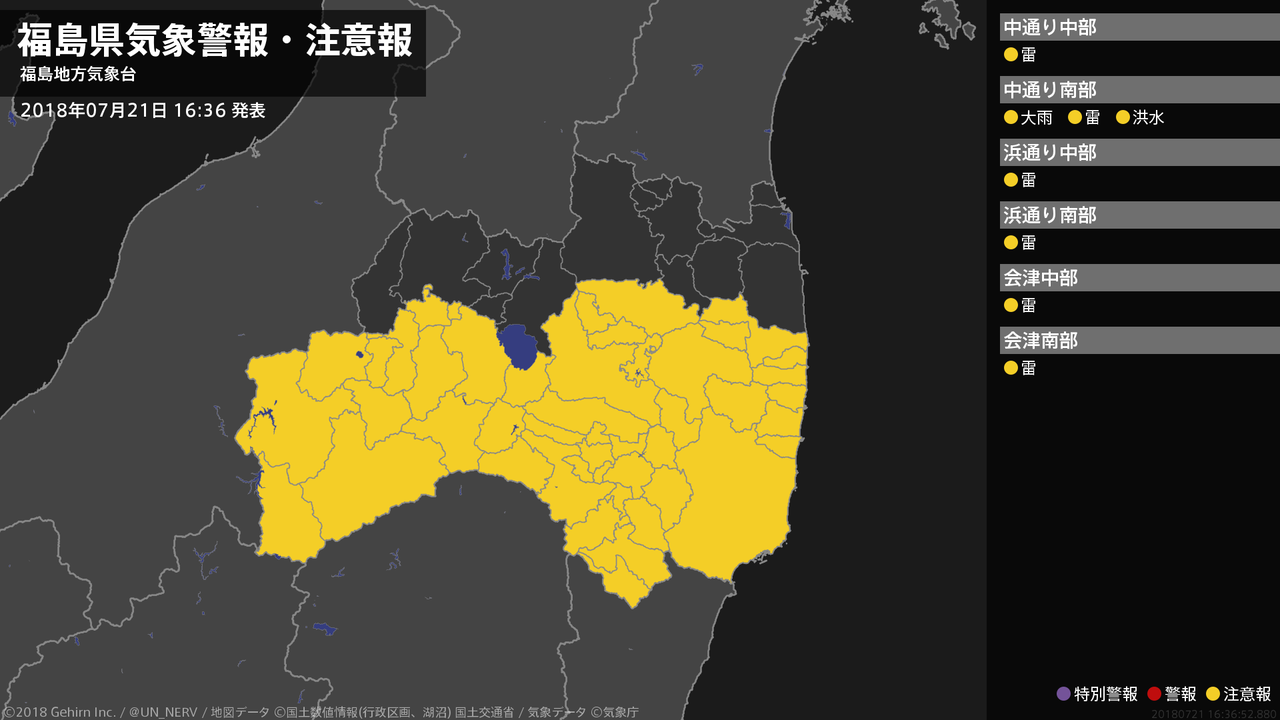 【福島県 気象警報・注意報 2018年07月21日 16:37】中通りでは、21日夜のはじめ頃まで低い土地の浸水や河川の増水に注意してください。福島県では、21日夜のはじめ頃まで竜巻などの激しい突風や落雷に注意してください。#気象警報注意報 #福島県