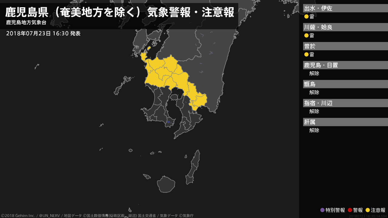 【鹿児島県(奄美地方を除く) 気象警報・注意報 2018年07月23日 16:30】薩摩、大隅地方では、23日夜のはじめ頃まで急な強い雨や落雷に注意してください。#気象警報注意報 #鹿児島県(奄美地方除く)