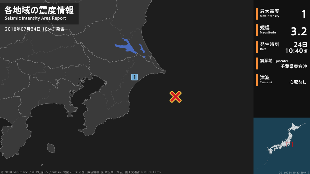 10時40分頃、千葉県東方沖を震源とする地震がありました。震源の深さは約20km、地震の規模はM3.2、最大震度1を千葉県で観測しています。この地震による津波の心配はありません。