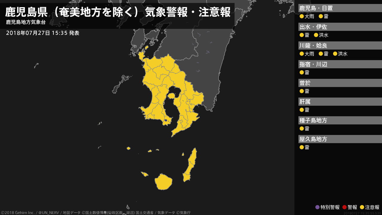【鹿児島県(奄美地方を除く) 気象警報・注意報 2018年07月27日 15:36】