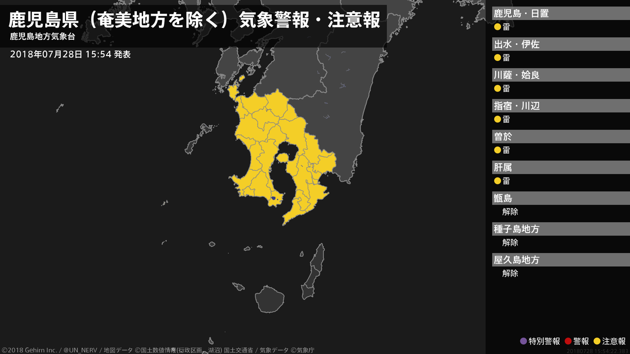 【鹿児島県(奄美地方を除く) 気象警報・注意報 2018年07月28日 15:54】薩摩、大隅地方では、28日夜のはじめ頃まで急な強い雨や落雷に注意してください。#気象警報注意報 #鹿児島県(奄美地方除く)