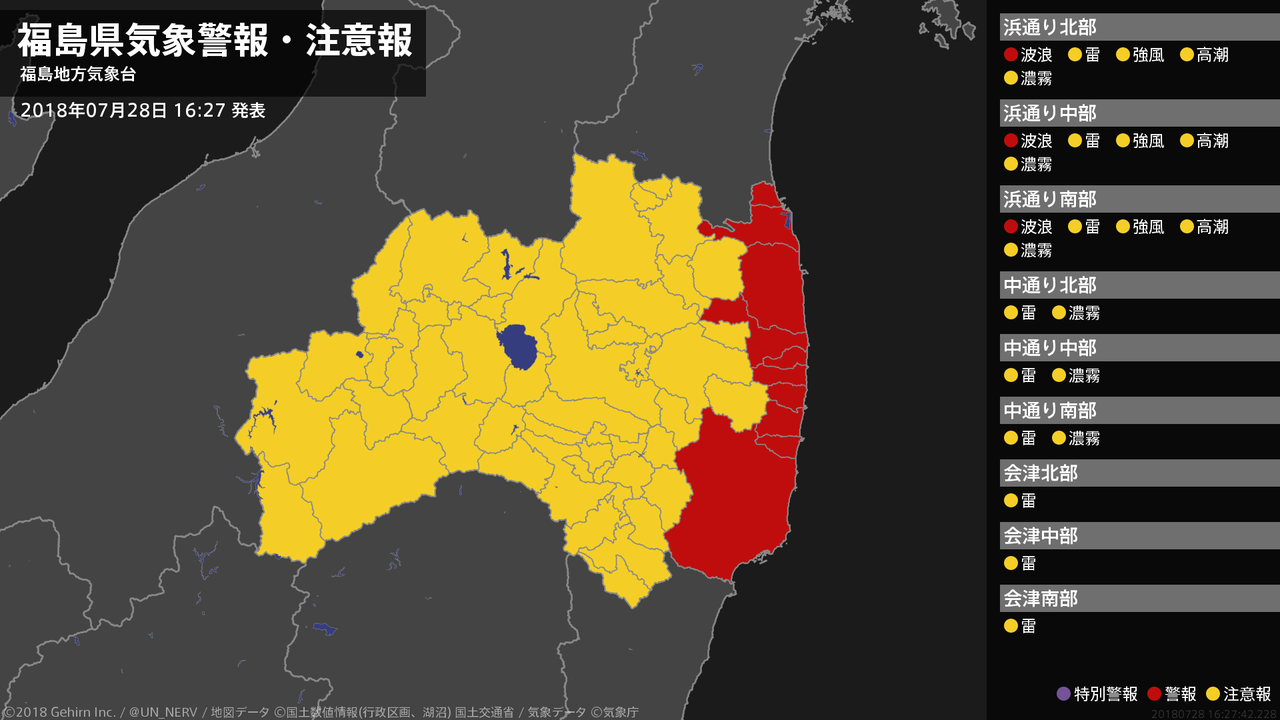【岩手県 気象警報・注意報 2018年07月28日 16:30】岩手県では、高波や濃霧による視程障害に注意してください。#気象警報注意報 #岩手県