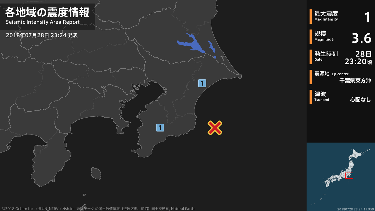 【地震情報 2018年7月28日】23時20分頃、千葉県東方沖を震源とする地震がありました。震源の深さは約50km、地震の規模はM3.6、最大震度1を千葉県で観測しています。この地震による津波の心配はありません。#地震 #千葉県