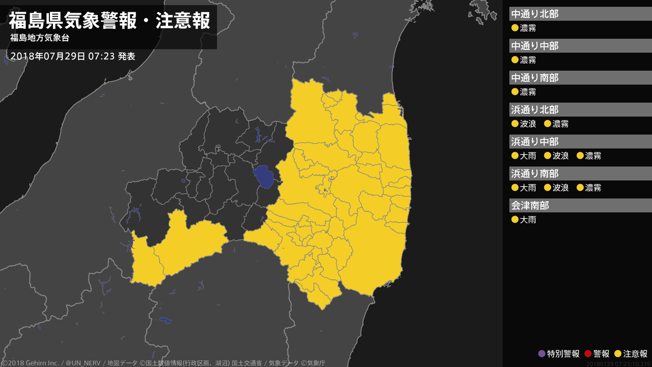 【福島県 気象警報・注意報 2018年07月29日 07:23】浜通り、会津では、29日昼前まで土砂災害に注意してください。浜通りでは、30日朝まで高波に注意してください。中通り、浜通りでは、29日昼前まで濃霧による視程障害に注意してください。#気象警報注意報 #福島県