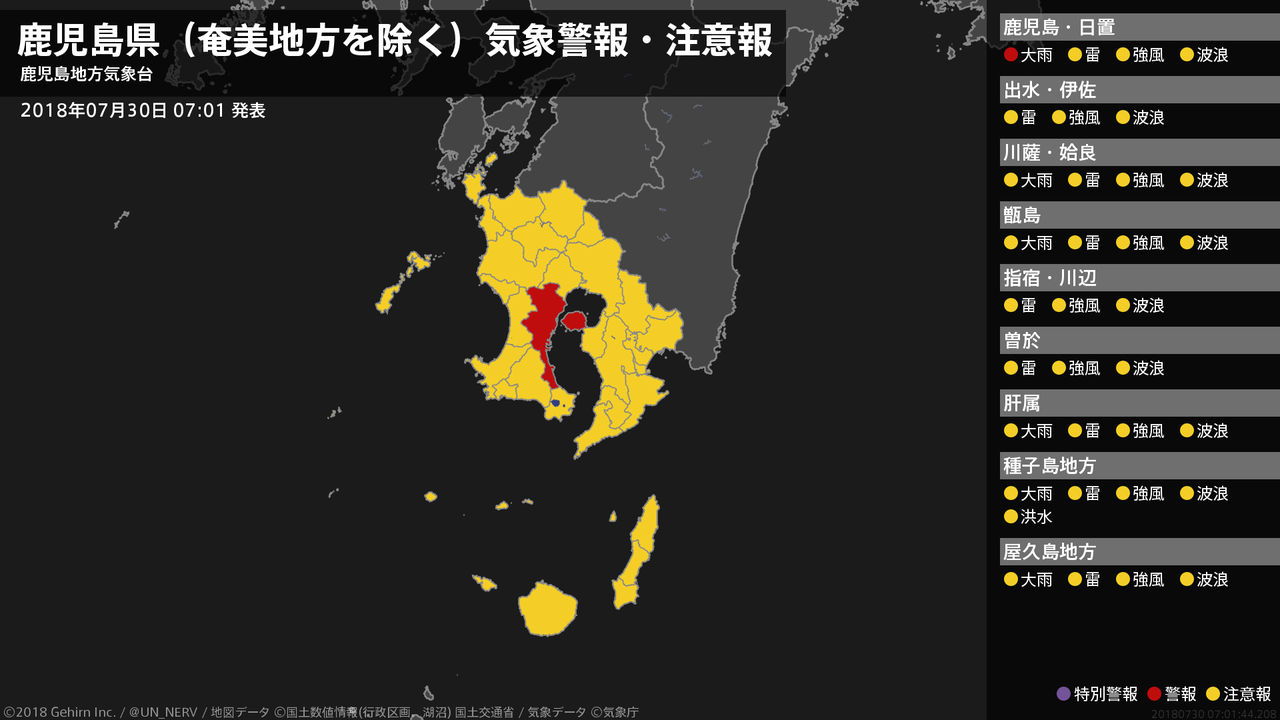 【鹿児島県(奄美地方を除く) 気象警報 2018年07月30日 07:35】種子島・屋久島地方では、30日昼前から30日夕方まで土砂災害に警戒してください。#気象警報 #気象警報注意報 #鹿児島県(奄美地方除く)