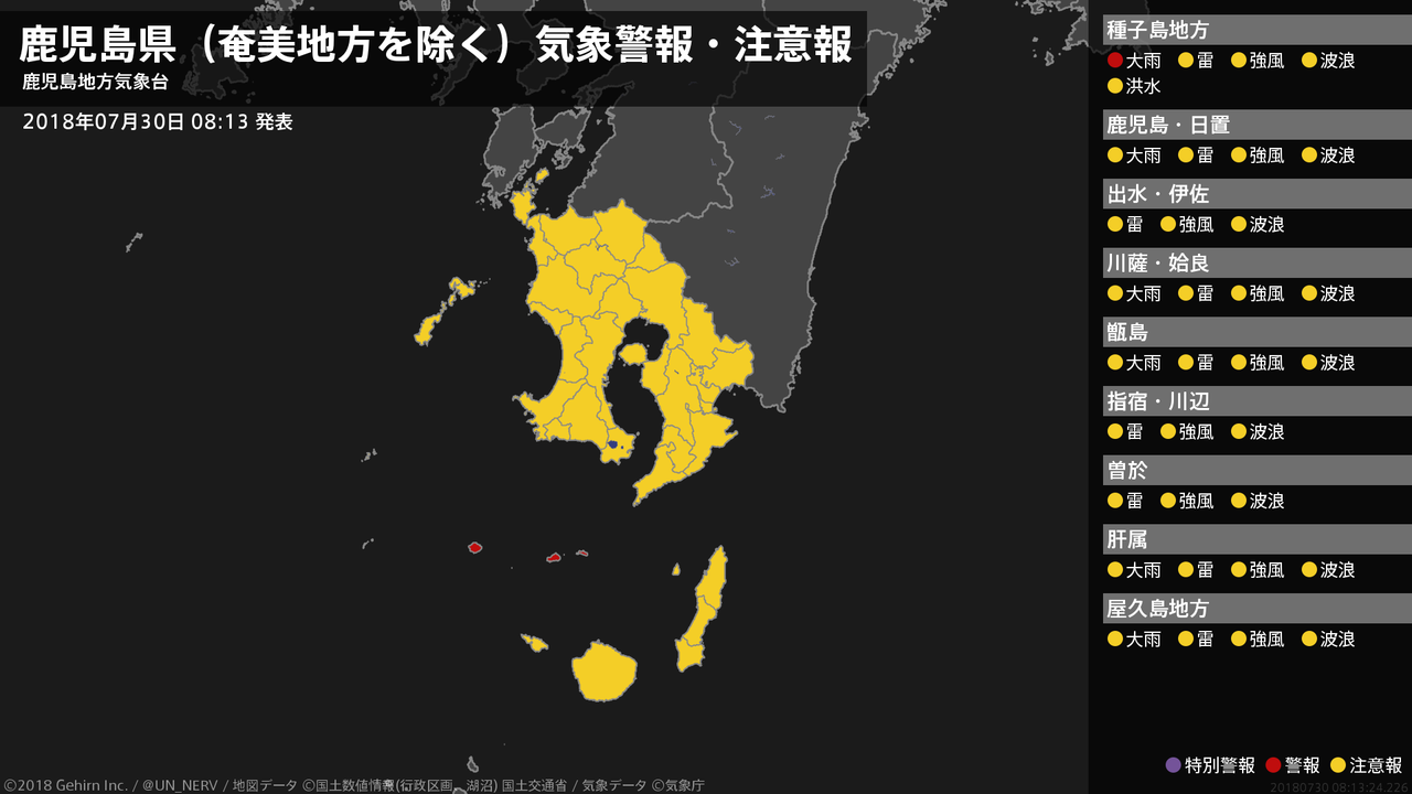 【鹿児島県(奄美地方を除く) 気象警報・注意報 2018年07月30日 08:13】種子島・屋久島地方では、30日昼前から30日夕方まで土砂災害に警戒してください。#気象警報注意報 #鹿児島県(奄美地方除く)