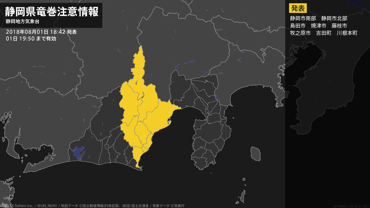 静岡県は、竜巻などの激しい突風が発生しやすい気象状況になっています。頑丈な建物内に移動するなど安全確保に努めてください。この情報は01日19:50まで有効です。