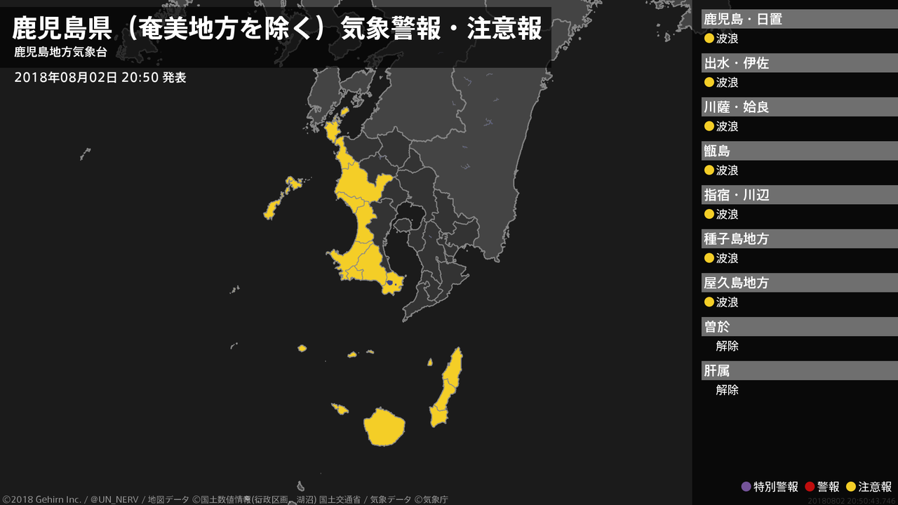 【鹿児島県(奄美地方を除く) 気象警報・注意報 2018年08月02日 20:50】