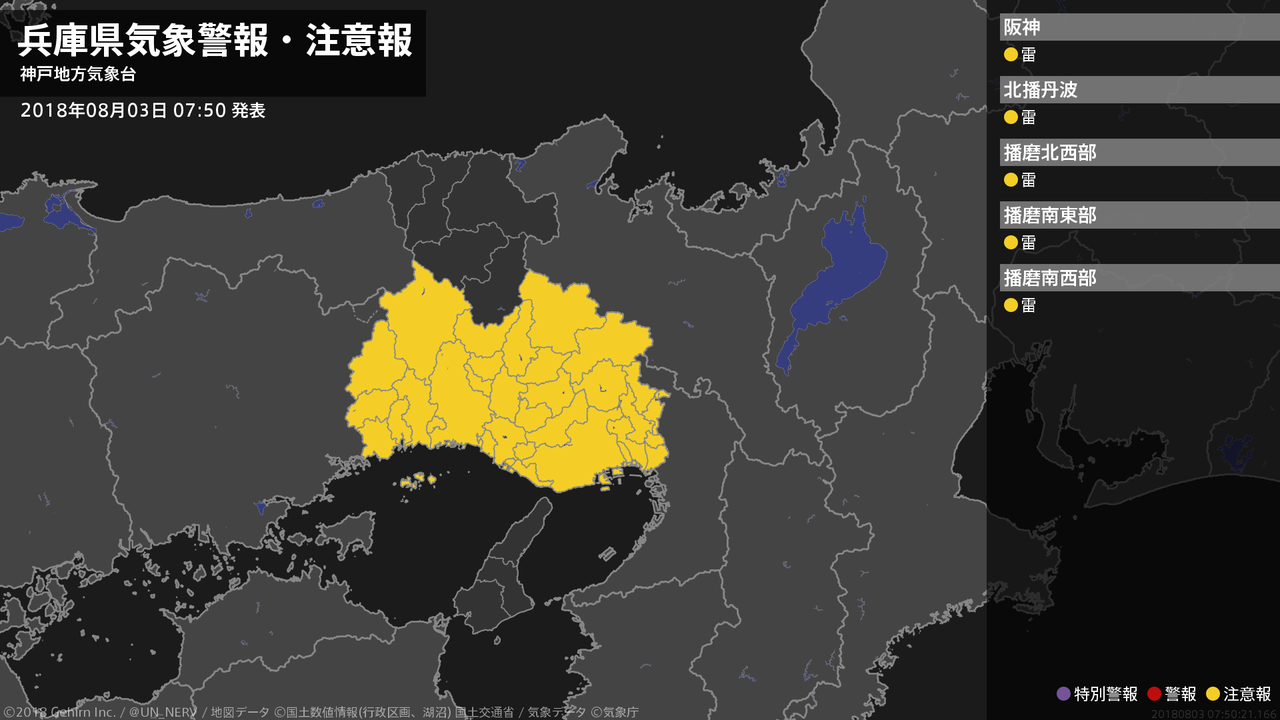 【兵庫県 気象警報・注意報 2018年08月03日 07:50】南部では、3日昼過ぎから3日夜のはじめ頃まで急な強い雨や落雷に注意してください。#気象警報注意報 #兵庫県