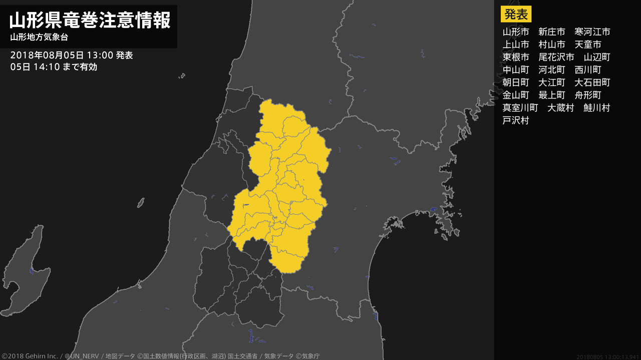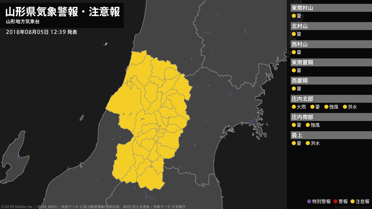 【山形県 気象警報・注意報 2018年08月05日 12:39】庄内では、土砂災害や強風に注意してください。庄内、最上では、河川の増水に注意してください。山形県では、竜巻などの激しい突風や落雷に注意してください。#気象警報注意報 #山形県