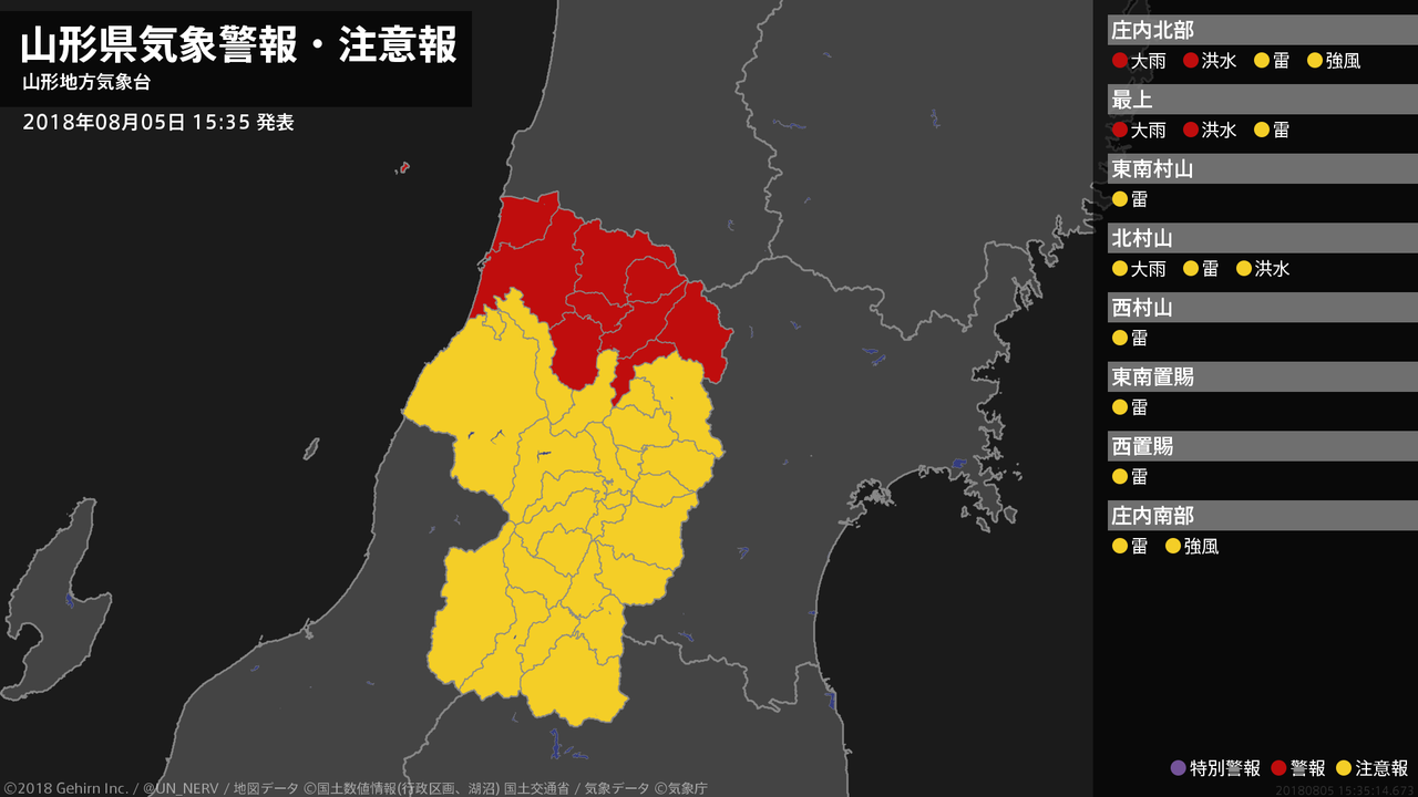 【山形県 気象警報・注意報 2018年08月05日 16:05】