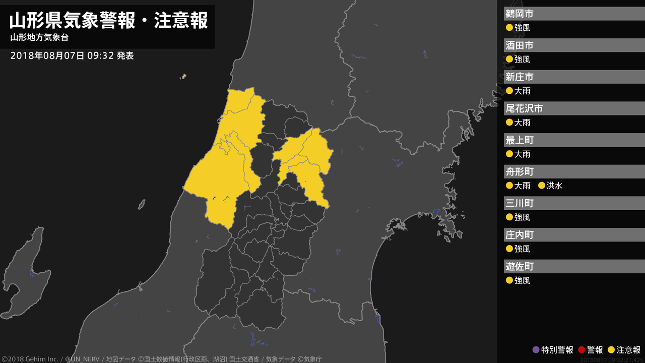 【山形県 気象警報・注意報 2018年08月07日 09:32】