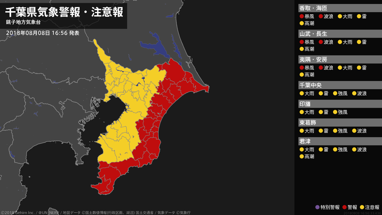 【千葉県 気象警報・注意報 2018年08月08日 16:56】
