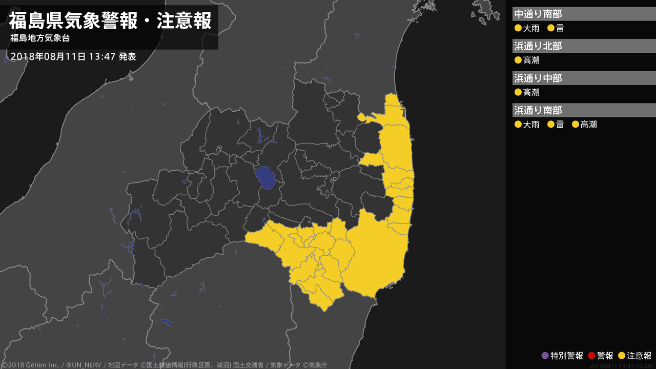 【福島県 気象警報・注意報 2018年08月11日 13:47】中通り、浜通りでは、11日夕方まで土砂災害に、11日夜のはじめ頃まで落雷に注意してください。浜通りでは、ここしばらく高潮に注意してください。#気象警報注意報 #福島県