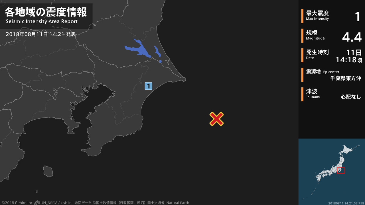 【地震情報 2018年8月11日】14時18分頃、千葉県東方沖を震源とする地震がありました。震源の深さは約30km、地震の規模はM4.4、最大震度1を千葉県で観測しています。この地震による津波の心配はありません。#地震 #千葉県