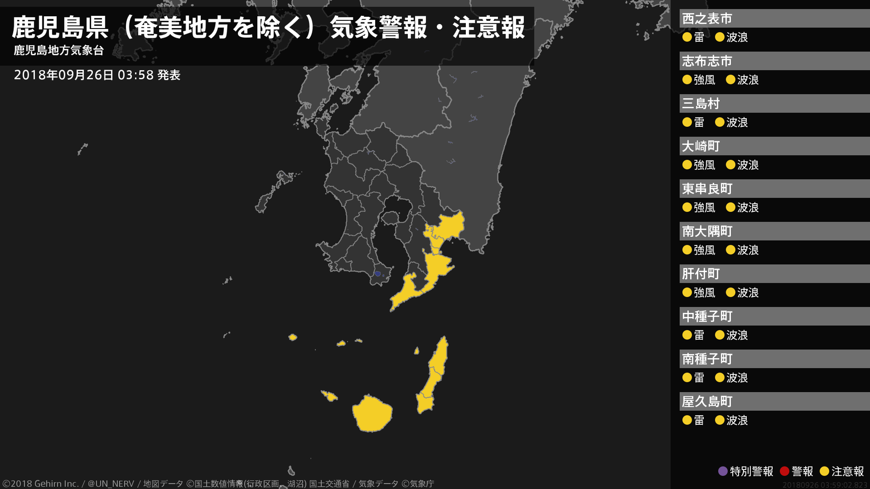 【鹿児島県(奄美地方を除く) 気象警報・注意報 2018年09月26日 03:59】