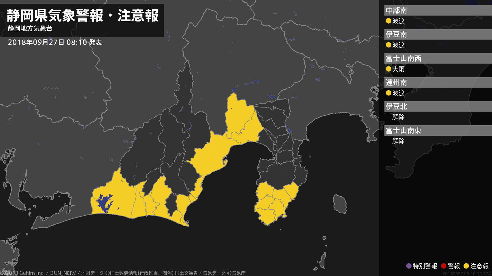 【静岡県 気象警報・注意報 2018年09月27日 08:10】東部では、27日昼前まで土砂災害に注意してください。中部、西部では27日昼前まで、伊豆では27日夕方まで、高波に注意してください。#気象警報注意報 #静岡県