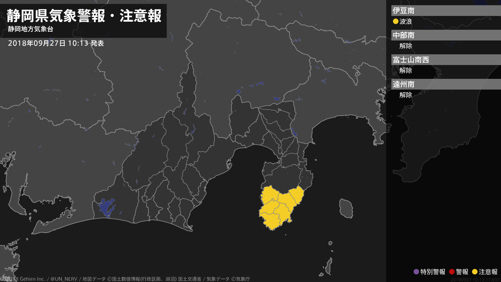 【静岡県 気象警報・注意報 2018年09月27日 10:13】伊豆では、27日夕方まで高波に注意してください。#気象警報注意報 #静岡県
