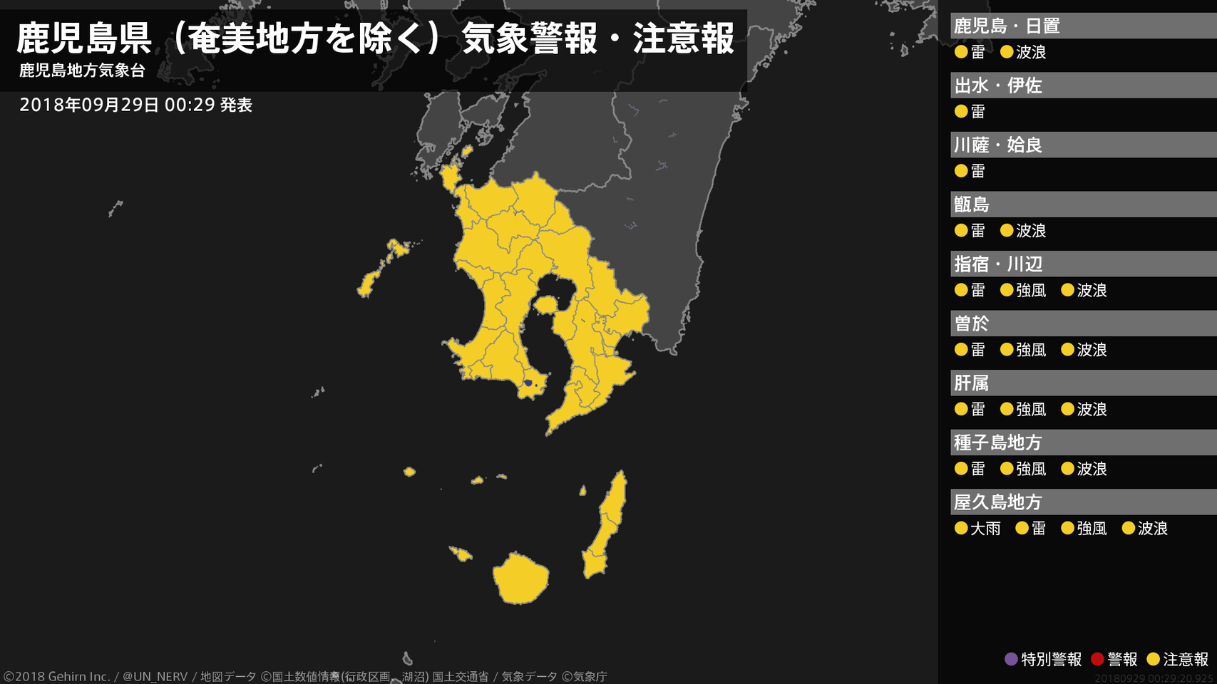 【鹿児島県(奄美地方を除く) 気象警報・注意報 2018年09月29日 00:29】種子島・屋久島地方では、土砂災害に注意してください。薩摩、大隅、種子島・屋久島地方では、強風や高波、竜巻などの激しい突風、落雷に注意してください。#気象警報注意報 #鹿児島県(奄美地方除く)
