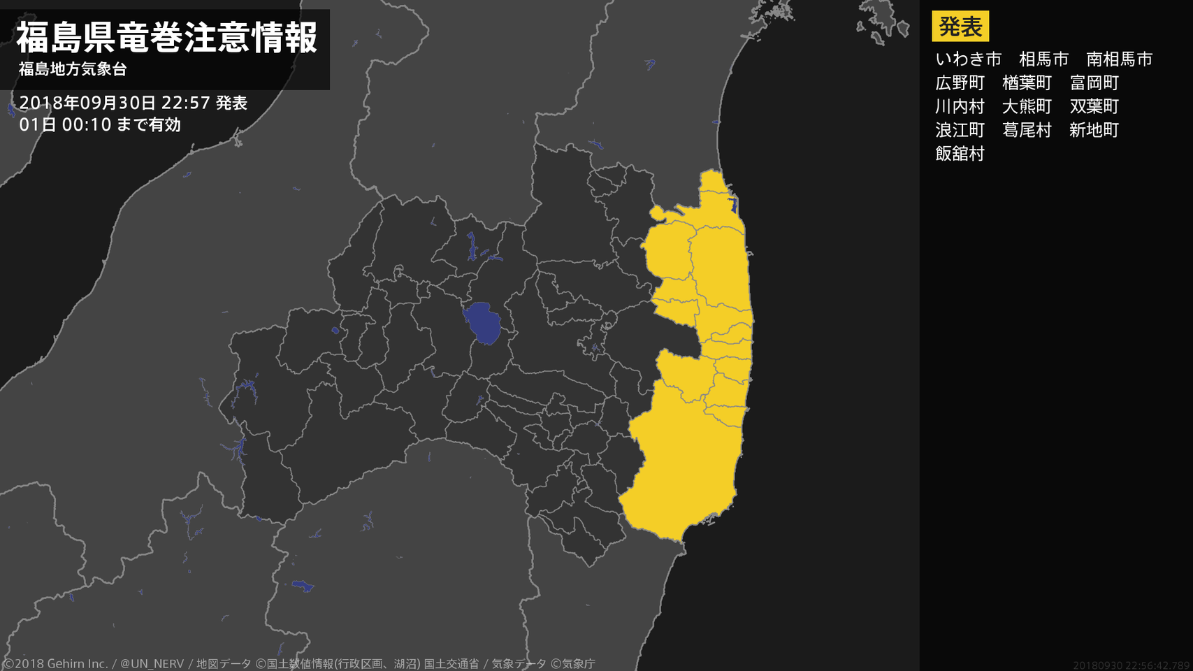 【福島県 竜巻注意情報】福島県は、竜巻などの激しい突風が発生しやすい気象状況になっています。頑丈な建物内に移動するなど安全確保に努めてください。この情報は01日00:10まで有効です。#竜巻注意情報 #福島県