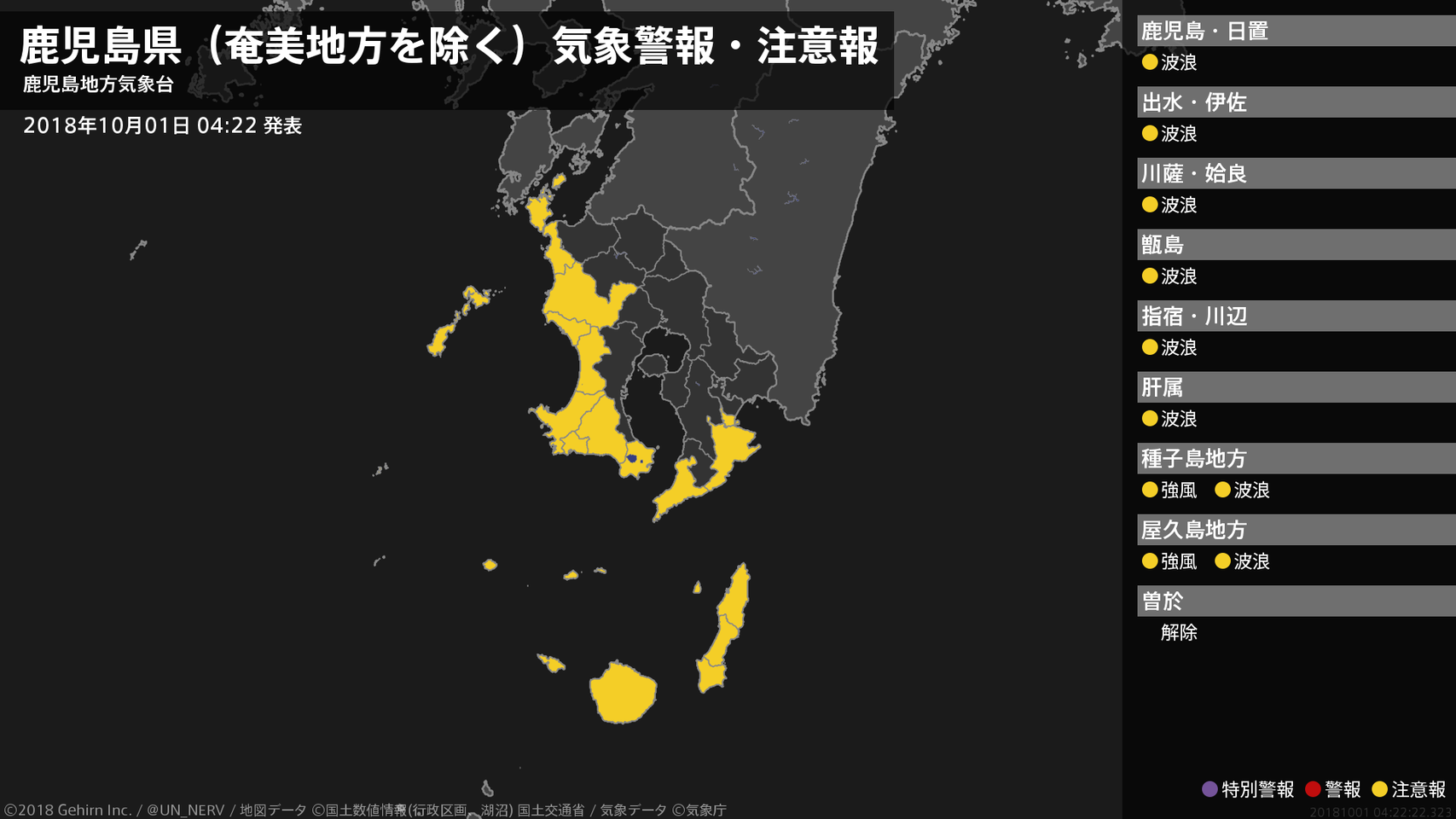 【鹿児島県(奄美地方を除く) 気象警報・注意報 2018年10月01日 04:22】種子島・屋久島地方では、1日朝まで強風に注意してください。薩摩、大隅、種子島・屋久島地方では、1日夜遅くまで高波に注意してください。#気象警報注意報 #鹿児島県(奄美地方除く)
