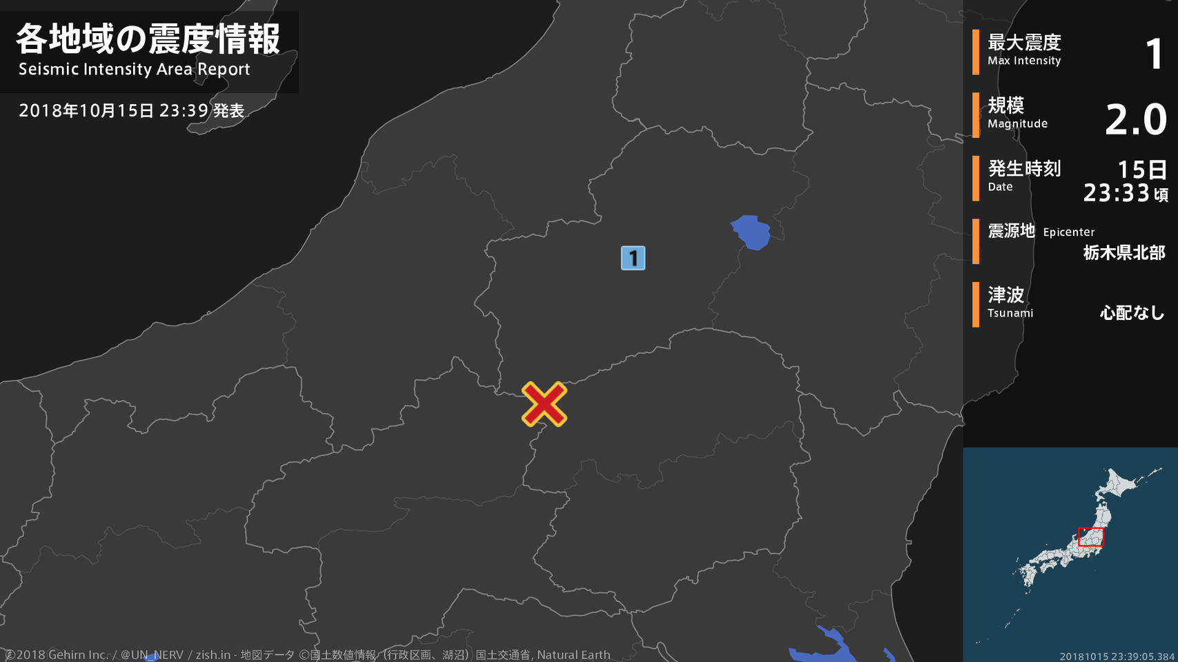 【地震情報 2018年10月15日】23時33分頃、栃木県北部を震源とする地震がありました。震源の深さは約10km、地震の規模はM2.0、最大震度1を福島県で観測しています。この地震による津波の心配はありません。#地震 #福島県