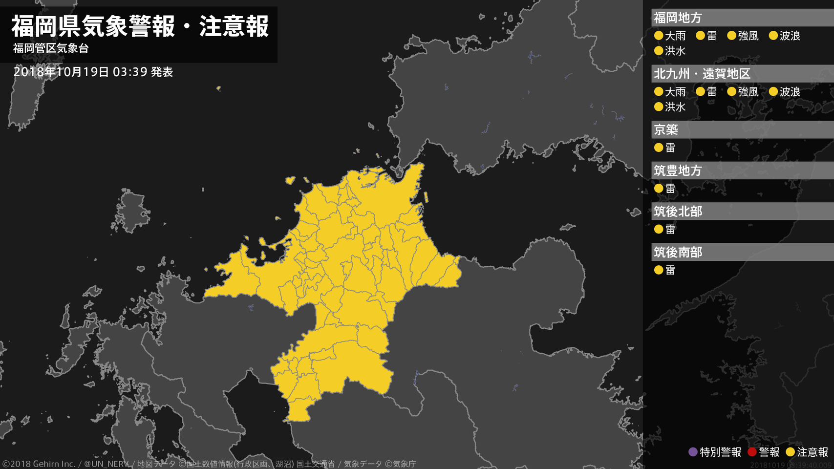 【福岡県 気象警報・注意報 2018年10月19日 03:39】