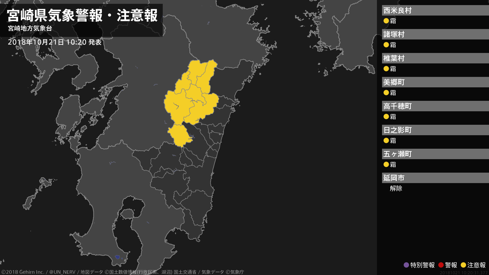 【宮崎県 気象警報・注意報 2018年10月21日 10:20】北部山沿いでは、22日朝は霜に対する農作物の管理に注意してください。#気象警報注意報 #宮崎県