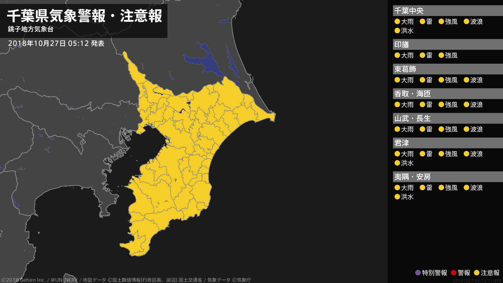 【千葉県 気象警報・注意報 2018年10月27日 05:12】南部では、土砂災害に注意してください。千葉県では、低い土地の浸水や強風、高波、竜巻などの激しい突風、落雷に注意してください。北西部、南部では、河川の増水に注意してください。#気象警報注意報 #千葉県