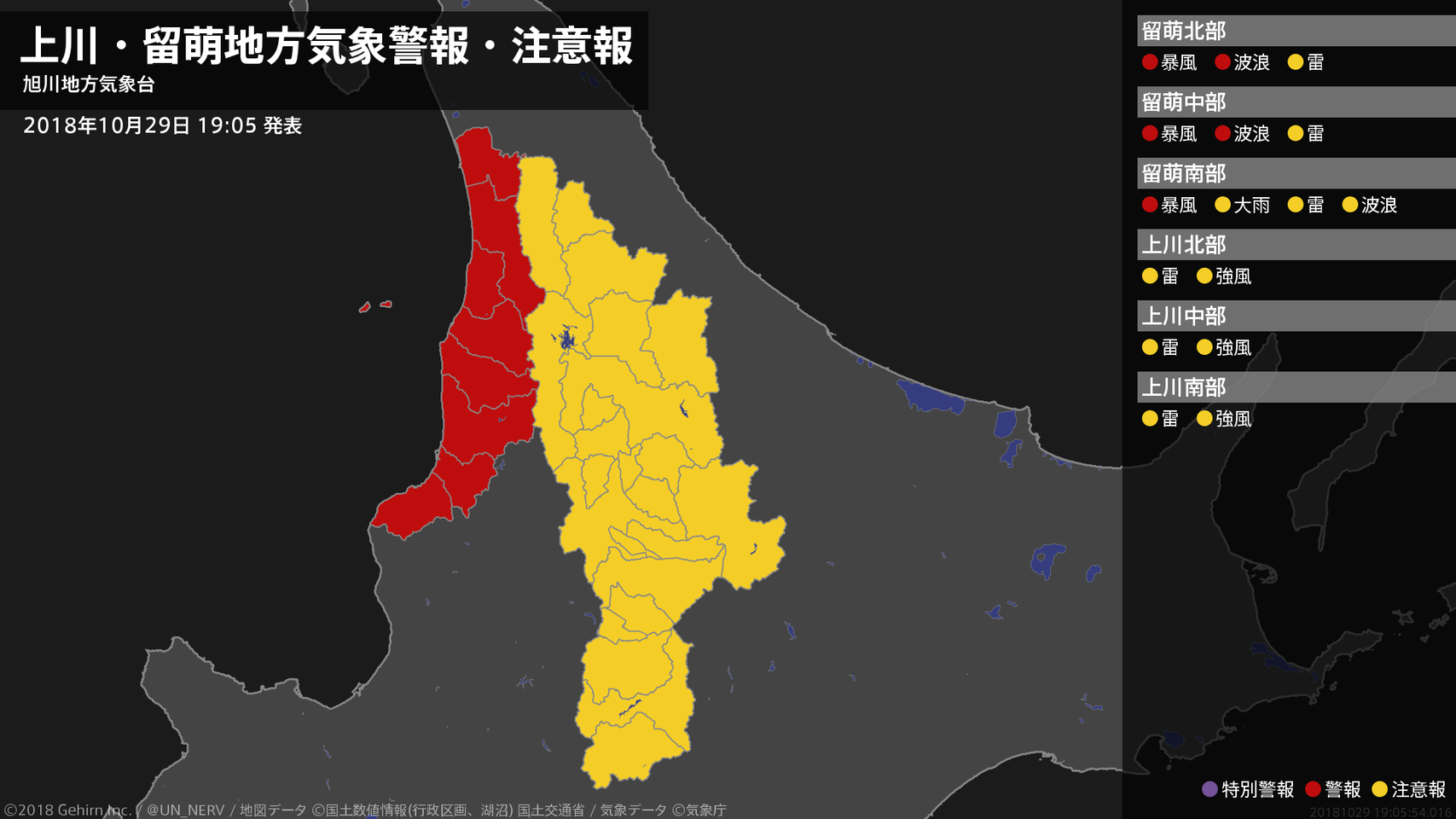 【上川・留萌地方 気象警報・注意報 2018年10月29日 19:05】