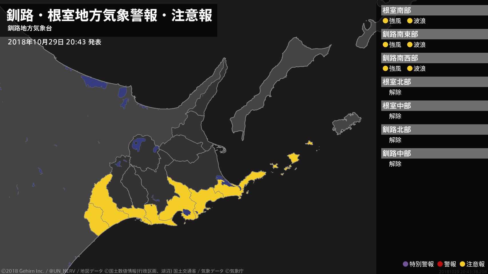 【釧路・根室地方 気象警報・注意報 2018年10月29日 20:43】