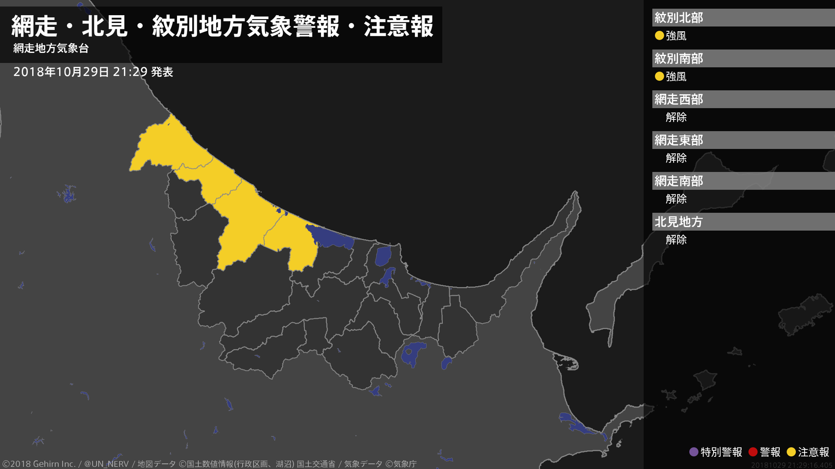 【網走・北見・紋別地方 気象警報・注意報 2018年10月29日 21:29】