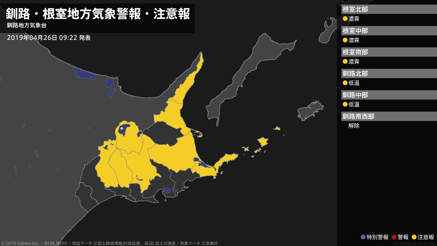 【釧路・根室地方 気象警報・注意報 2019年04月26日 09:22】根室地方では、27日昼前まで濃霧による視程障害に注意してください。釧路地方では、27日まで低温に注意してください。#気象警報注意報 #根室地方 #釧路地方
