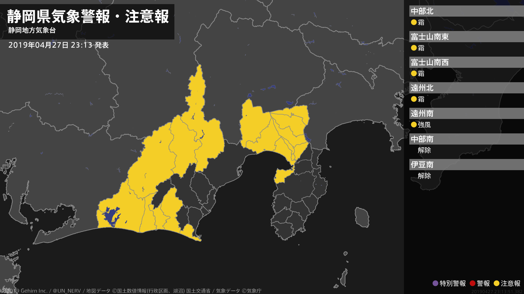【静岡県 気象警報・注意報 2019年04月27日 23:13】西部では、28日明け方まで強風に注意してください。中部、東部、西部では、28日朝は霜に対する農作物の管理に注意してください。#気象警報注意報 #静岡県