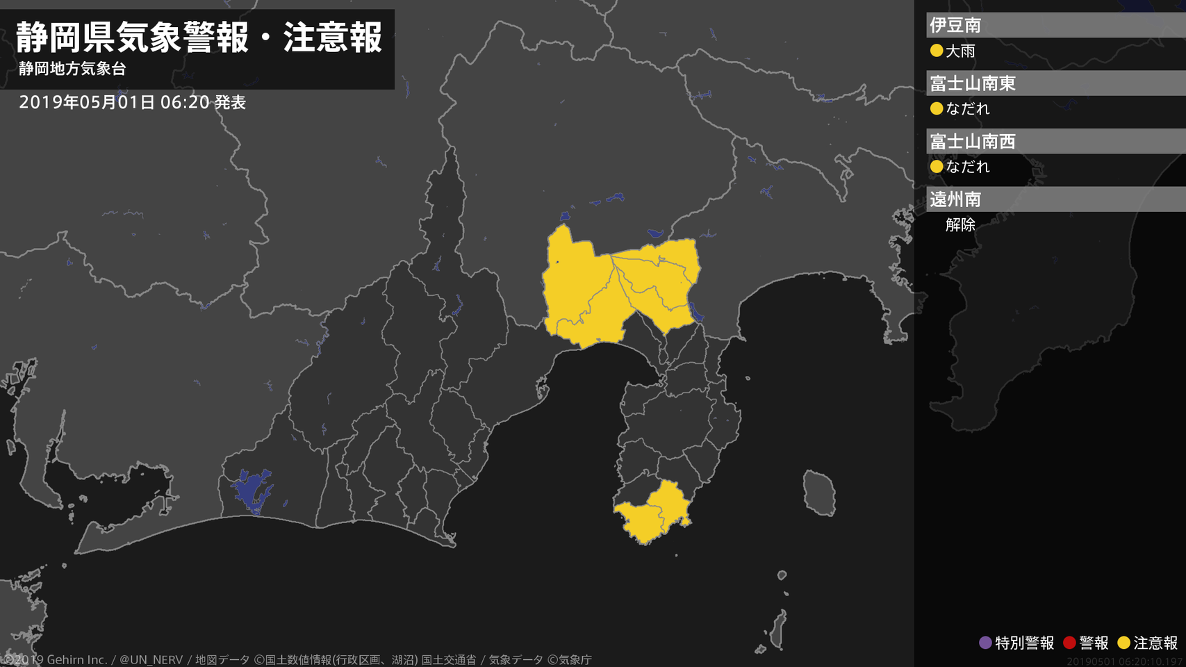 【静岡県 気象警報・注意報 2019年05月01日 06:20】伊豆では、1日昼前まで土砂災害に注意してください。富士山では、1日までなだれに注意してください。#気象警報注意報 #静岡県