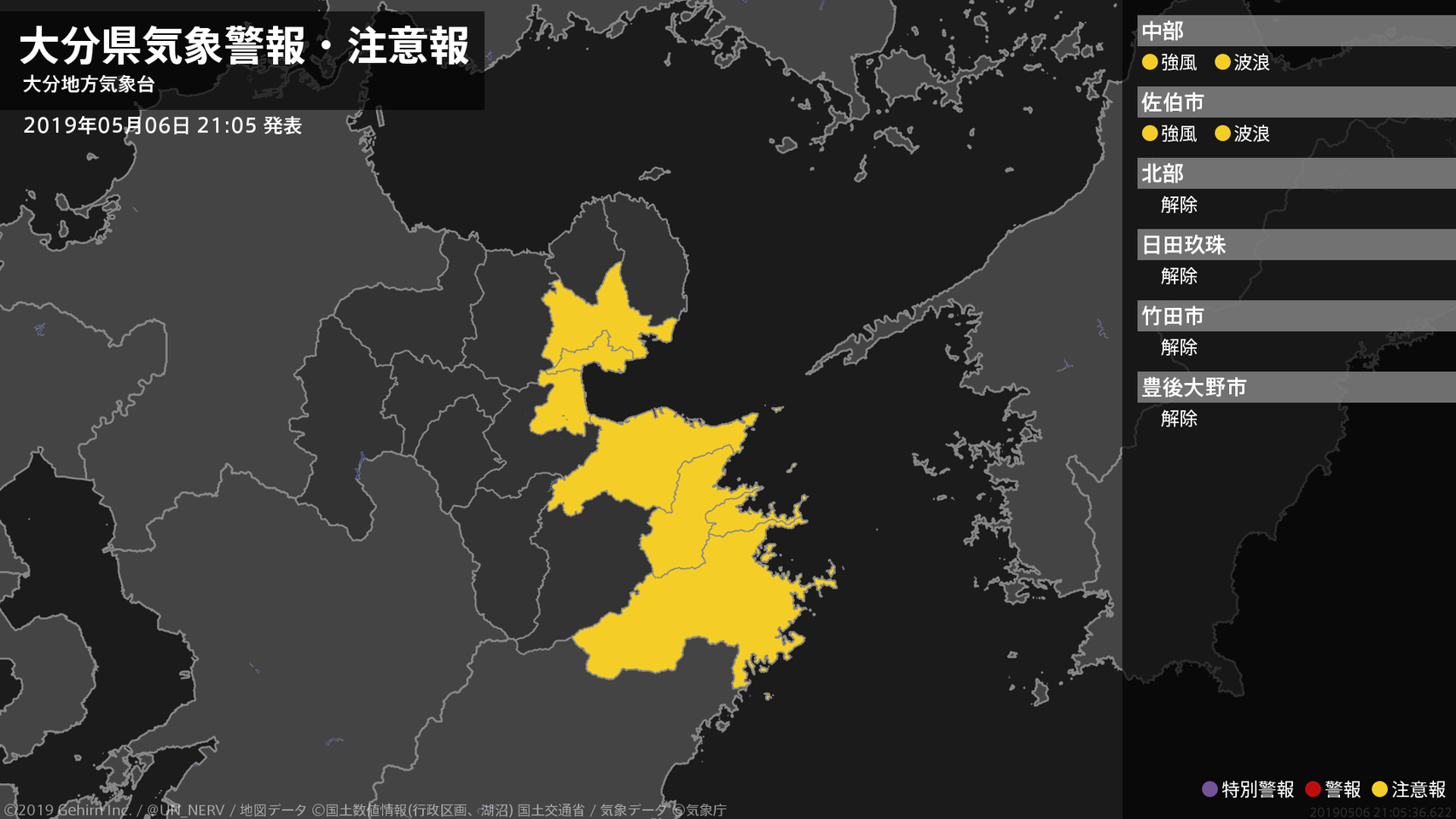 【大分県 気象警報・注意報 2019年05月06日 21:05】中部では7日明け方まで、南部では7日夕方まで、強風に注意してください。中部、南部では、7日未明から7日明け方まで高波に注意してください。#気象警報注意報 #大分県