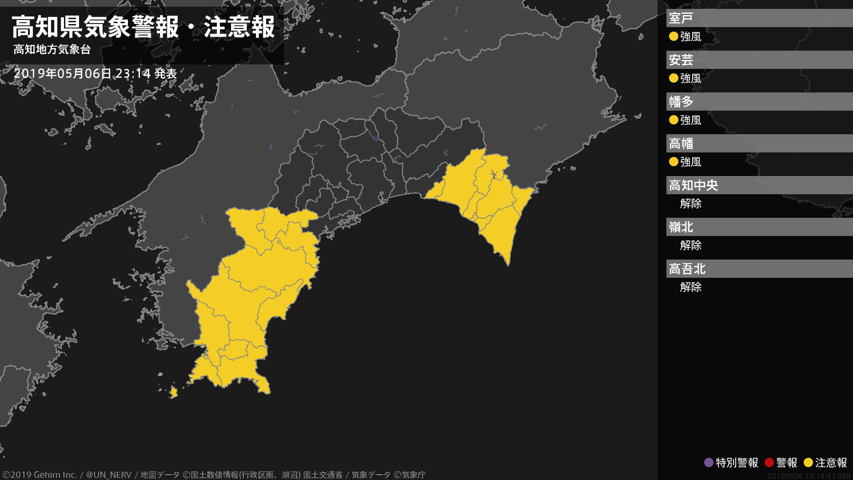 【高知県 気象警報・注意報 2019年05月06日 23:14】東部、西部では、7日夕方まで強風に注意してください。#気象警報注意報 #高知県